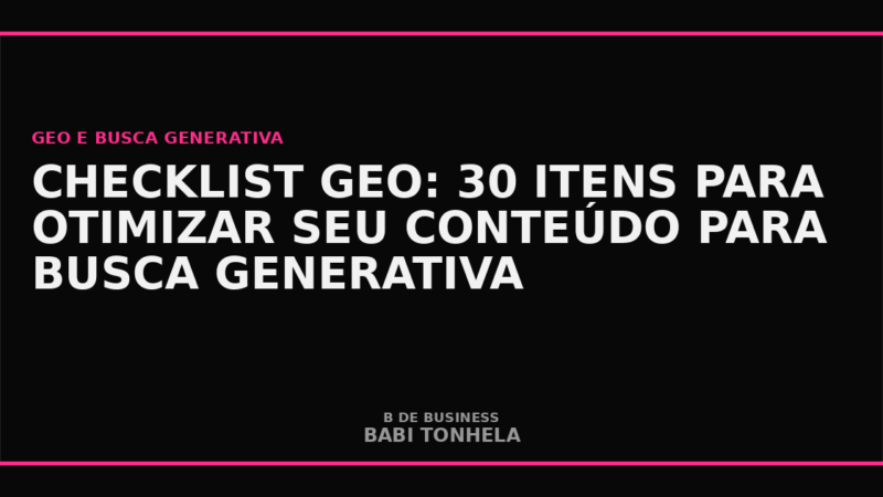 Checklist prático com 30 ações para otimizar conteúdo para IAs generativas. Dividido em 4 blocos: estrutura, citabilidade, autoria...