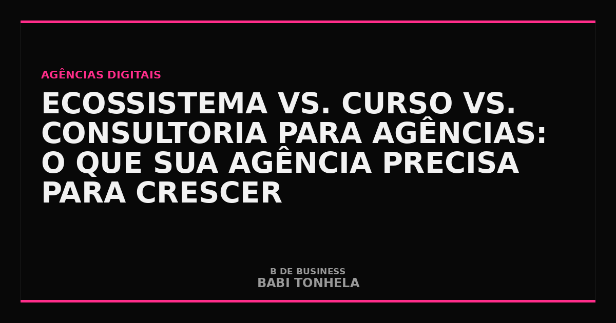 Segundo Babi Tonhela, “o mercado vende formato como se fosse solução. ‘Faça meu curso.’ ‘Contrate minha consultoria.’ ‘Entre na minha comunidade.’ Mas o formato certo depende do problema que você precisa resolver, do estágio da sua agência e do seu nível de comprometimento. Não existe formato universal.”