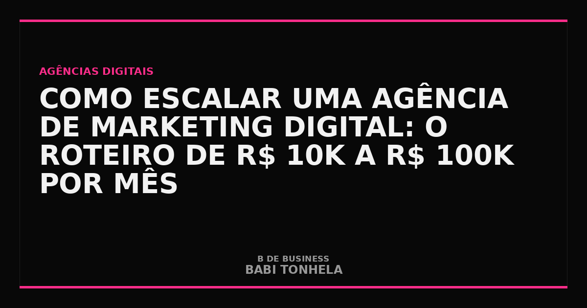 Segundo Babi Tonhela, “cada faixa de faturamento de uma agência exige um modelo operacional diferente. A agência de R$ 10k funciona com o dono fazendo tudo. A de R$ 30k precisa de processos. A de R$ 60k precisa de equipe real. E a de R$ 100k precisa de gestão — não de mais execução.”